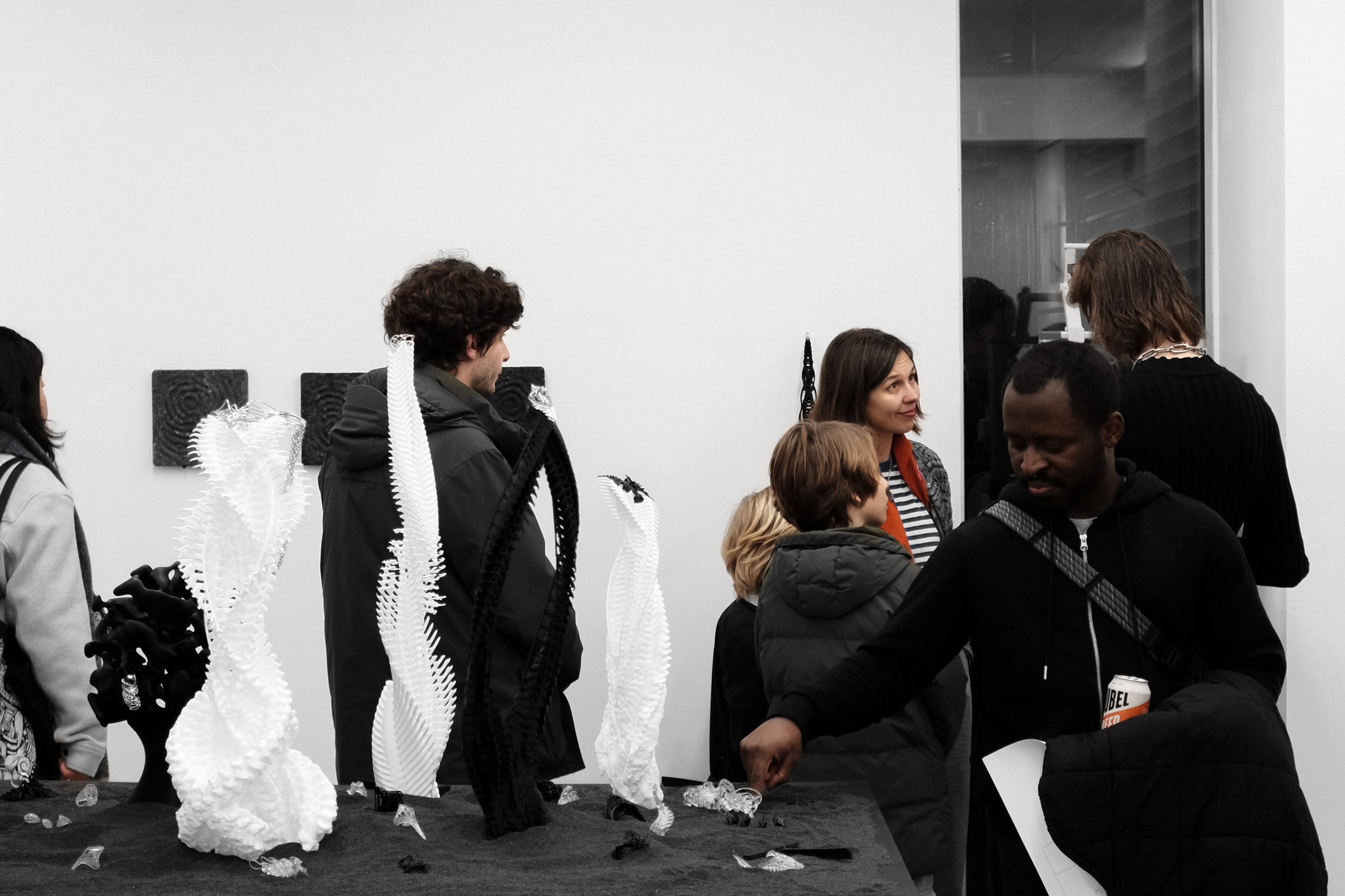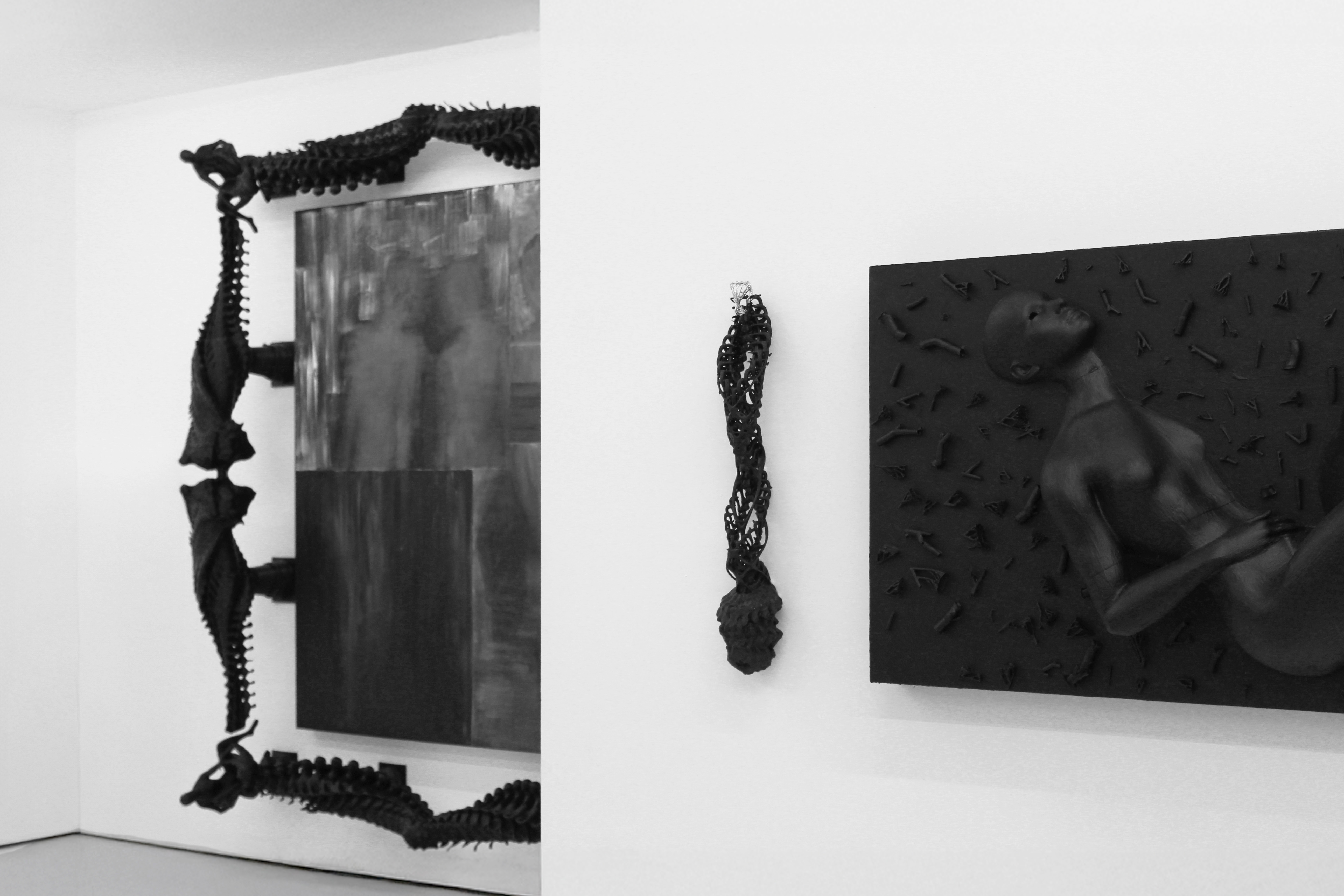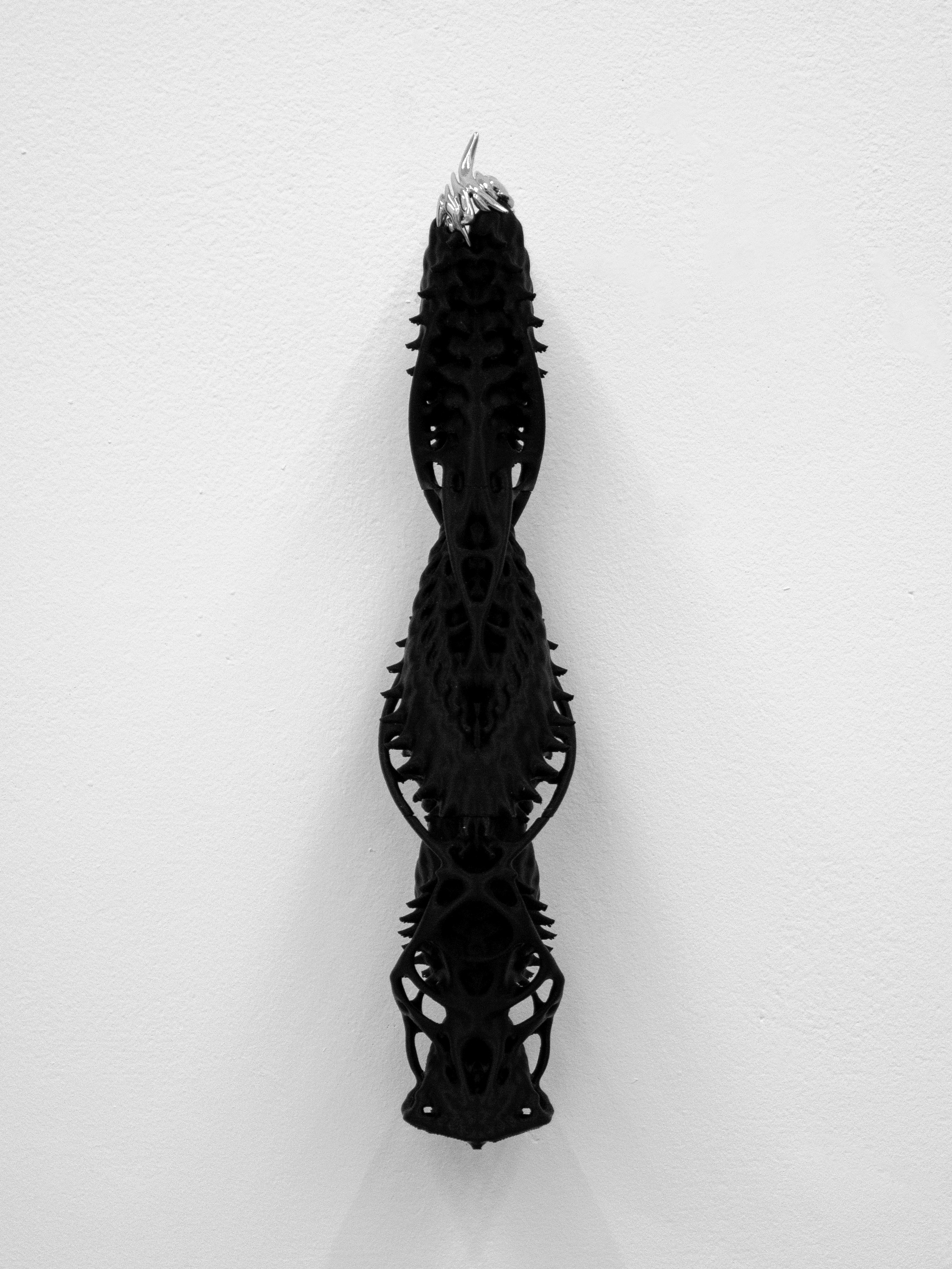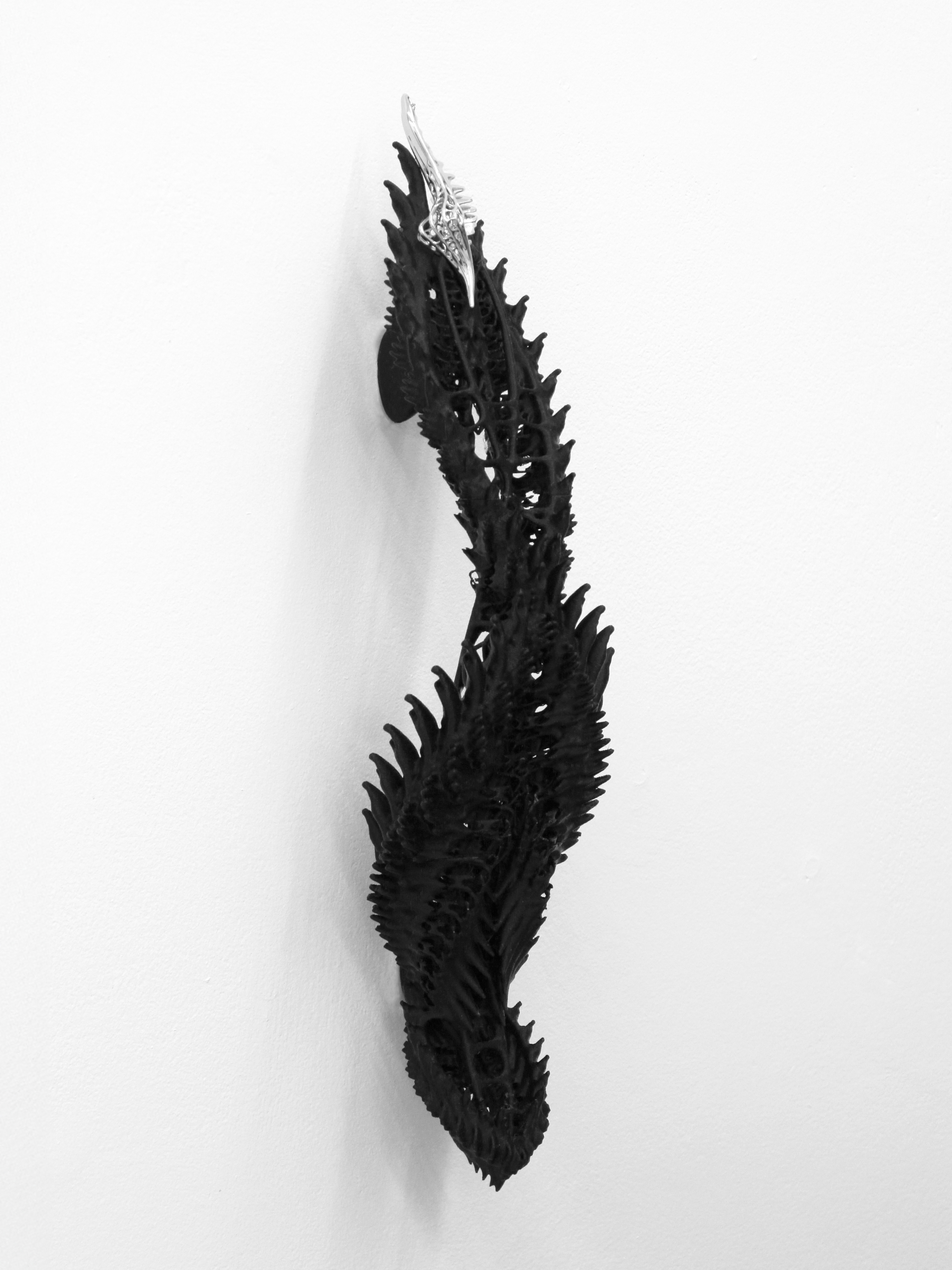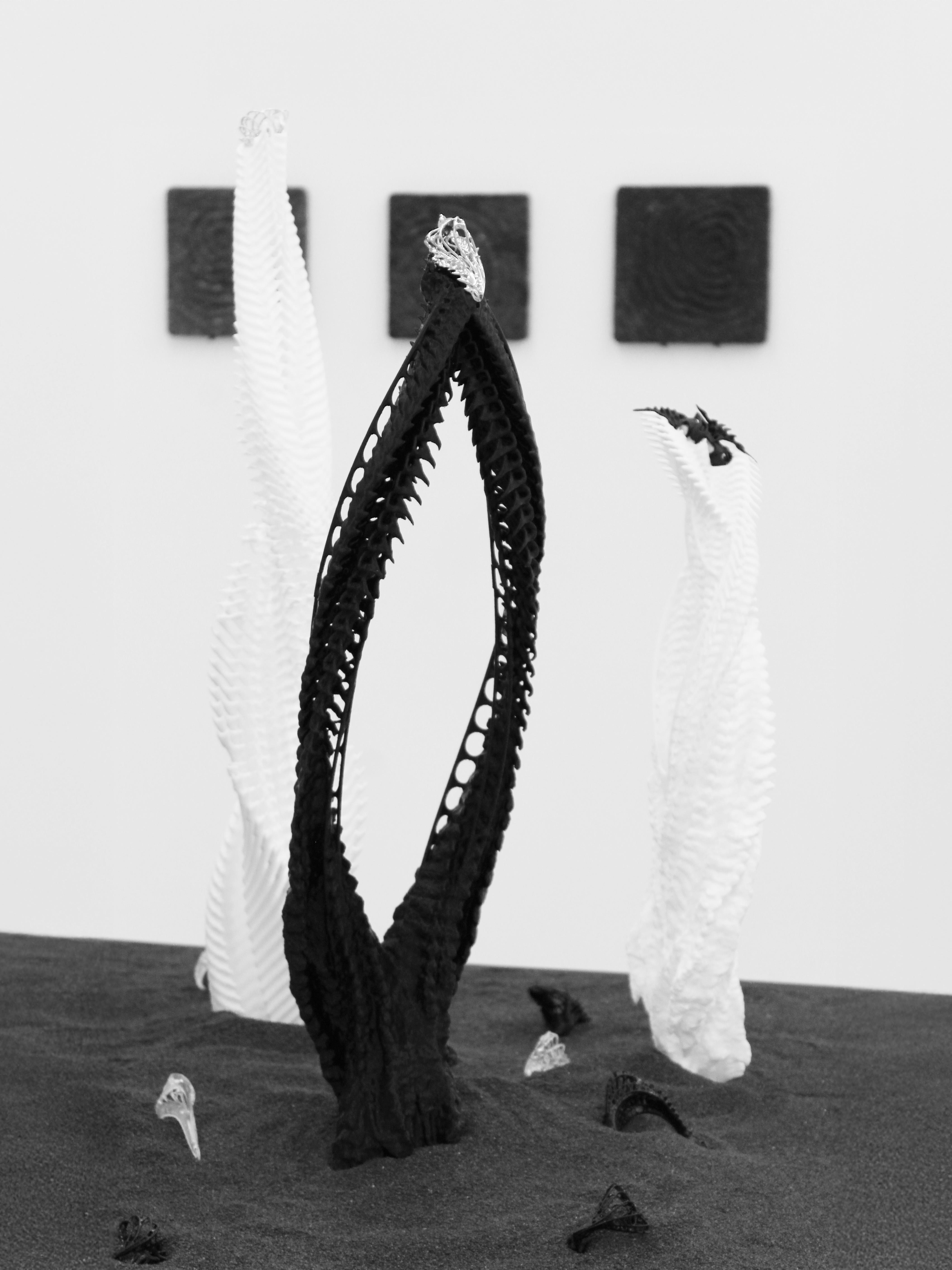 The exhibition opens with digitally fabricated, spinal-esque, wall mounted sculptures before giving way to a mycelial-erotic life sized human sculpture. In the center of the exhibition is a black sand covered table with cobra-sized biomorphic stands topped with jewellery pieces. On the back wall is a shadowy oil-painting of overlapping silhouettes surrounded by a 3D printed frame made of writhing body forms.
