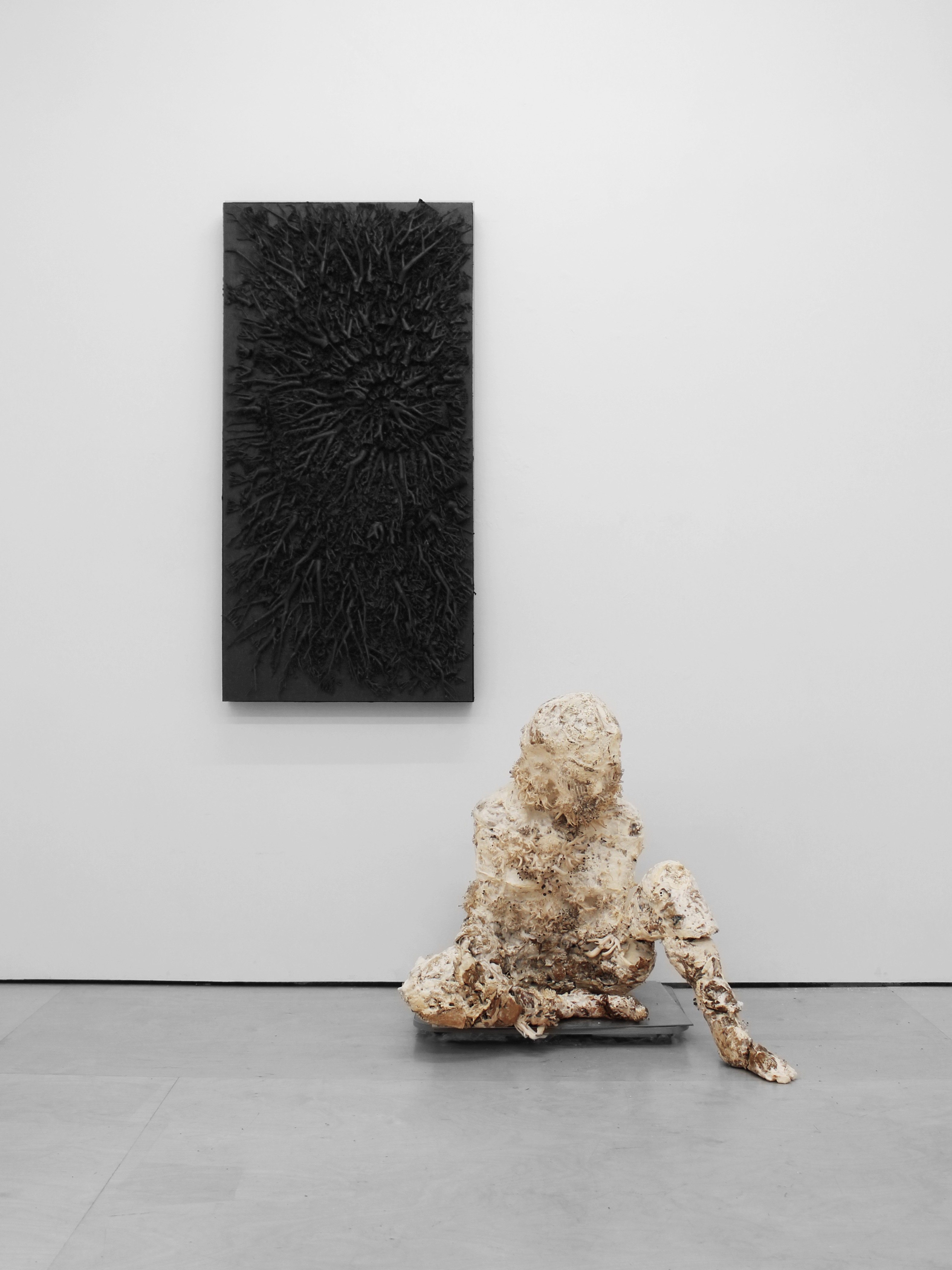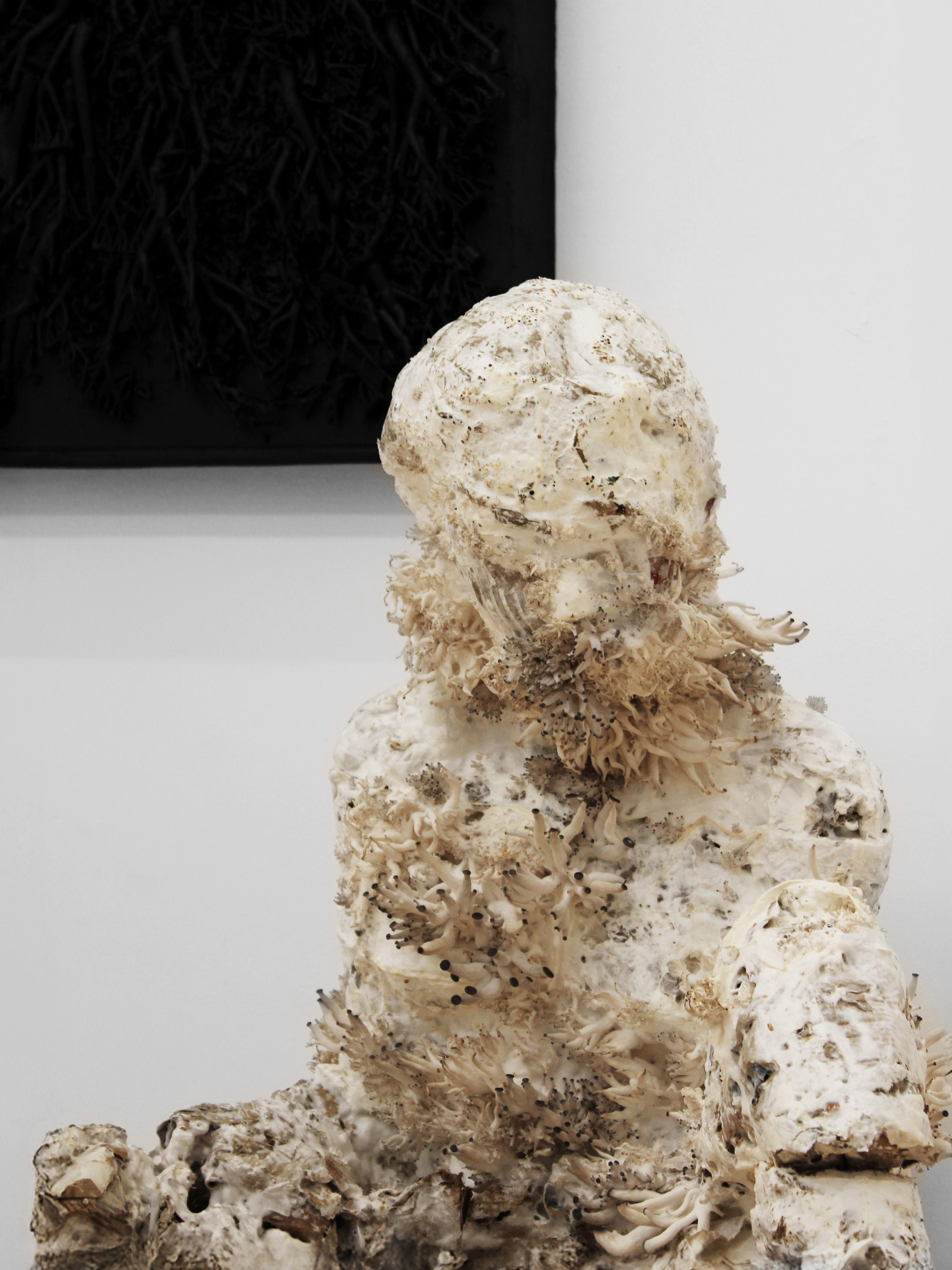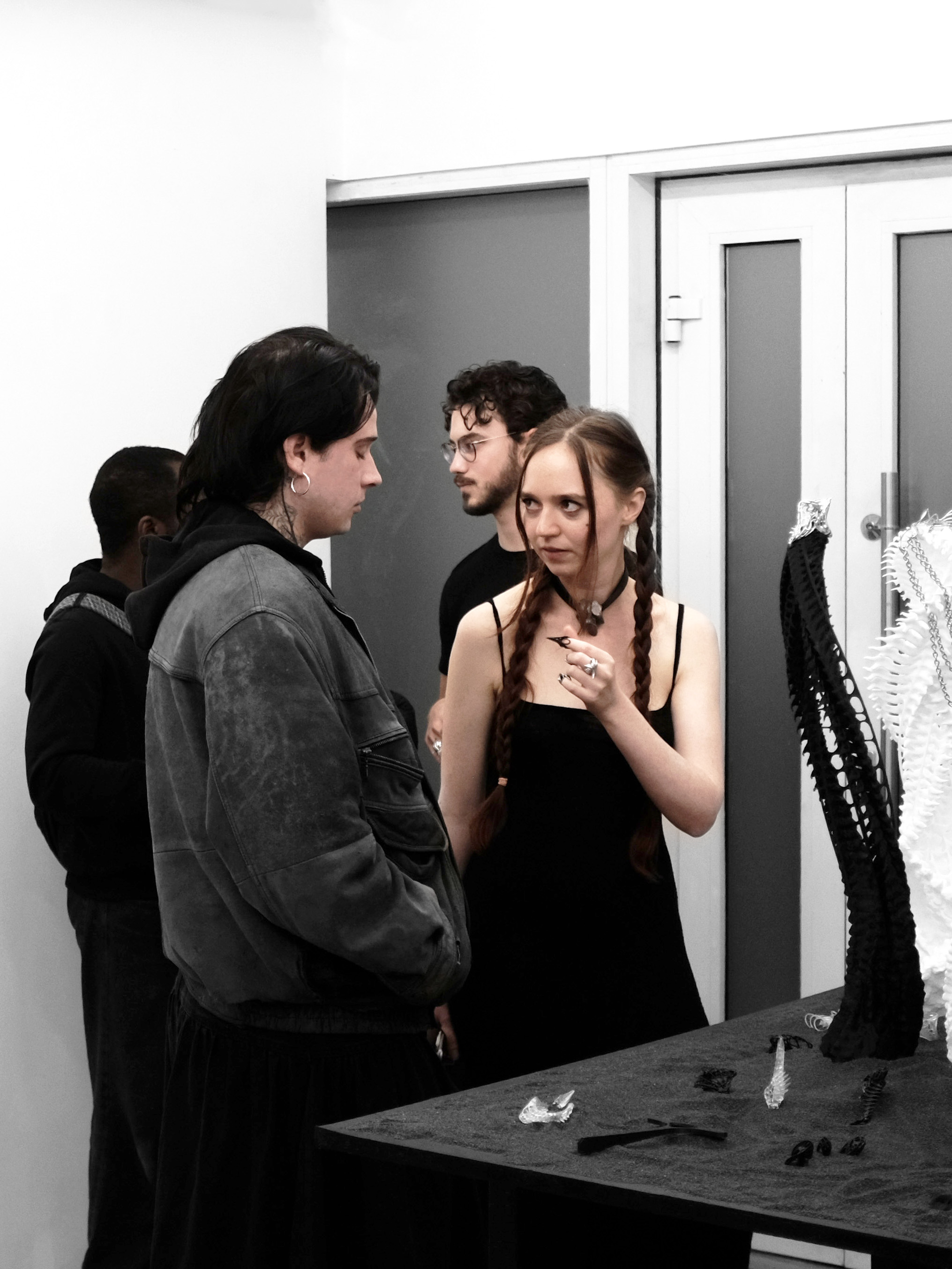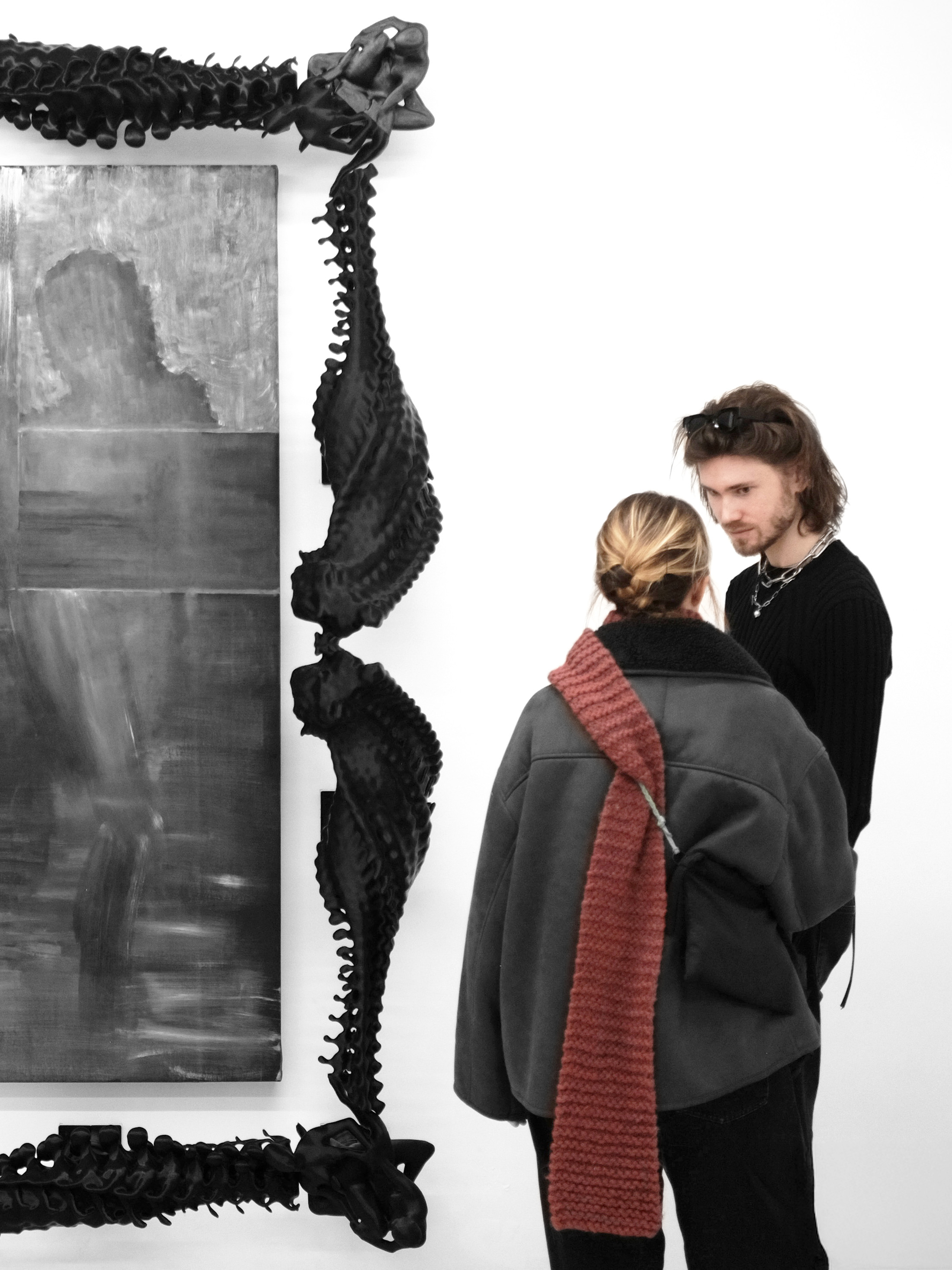 The exhibition opens with digitally fabricated, spinal-esque, wall mounted sculptures before giving way to a mycelial-erotic life sized human sculpture. In the center of the exhibition is a black sand covered table with cobra-sized biomorphic stands topped with jewellery pieces. On the back wall is a shadowy oil-painting of overlapping silhouettes surrounded by a 3D printed frame made of writhing body forms.