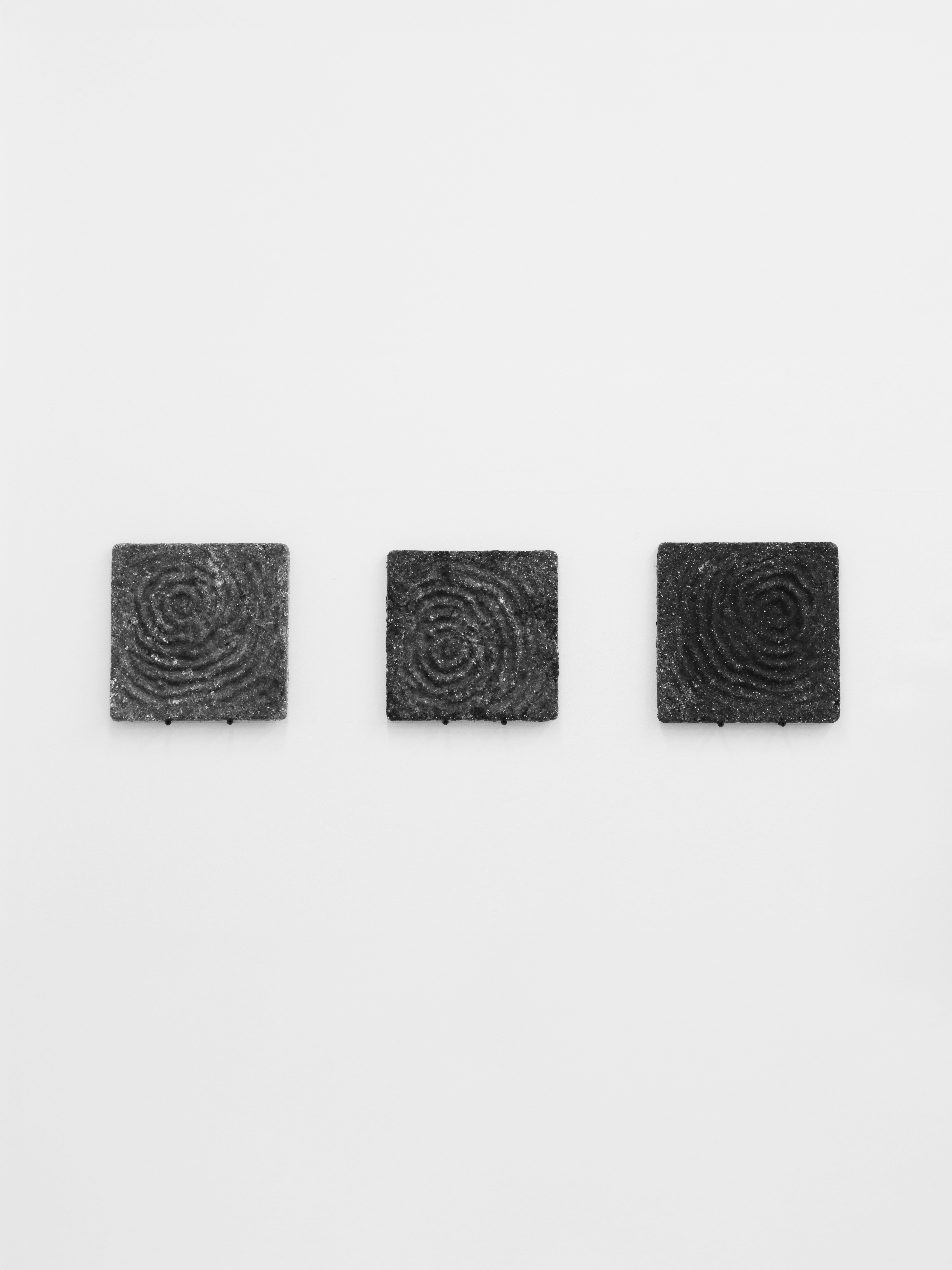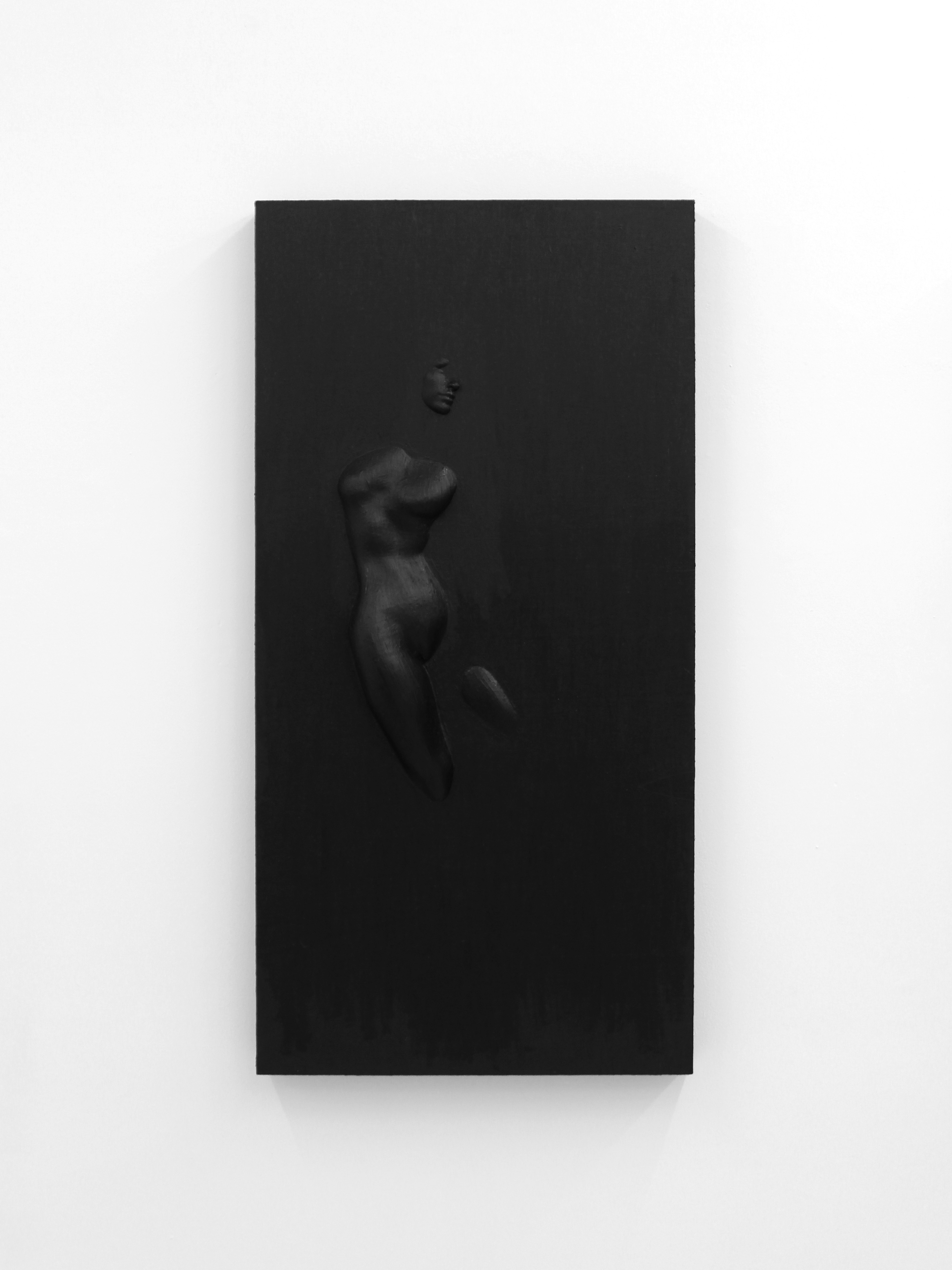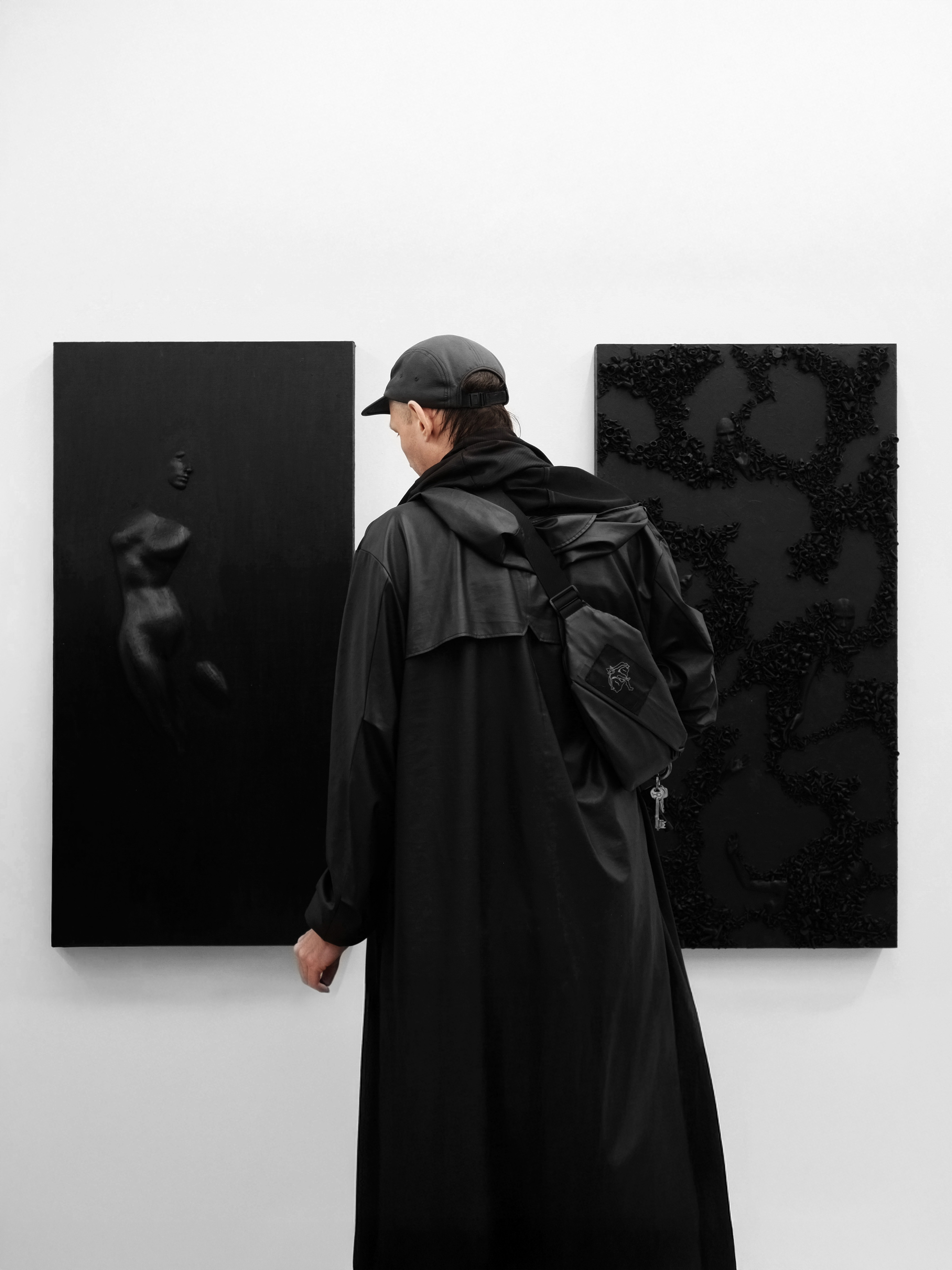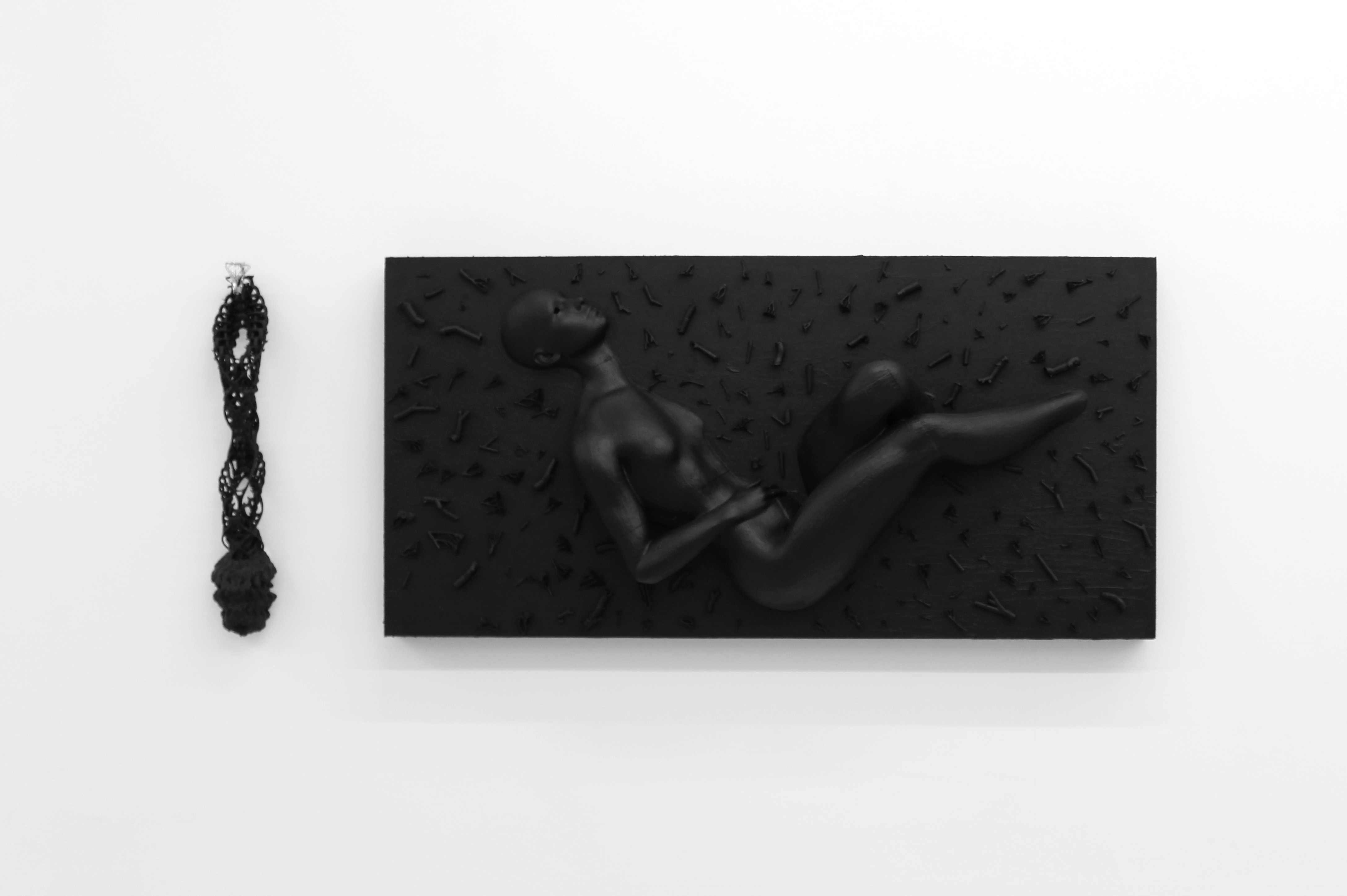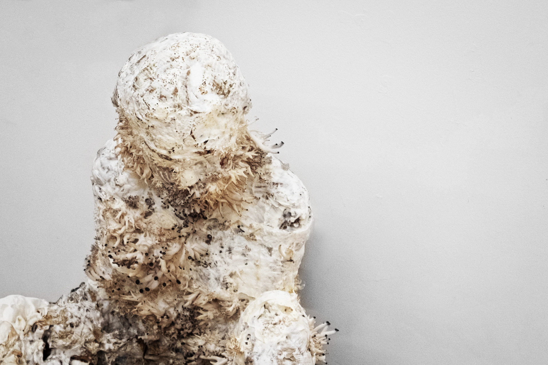 The exhibition opens with digitally fabricated, spinal-esque, wall mounted sculptures before giving way to a mycelial-erotic life sized human sculpture. In the center of the exhibition is a black sand covered table with cobra-sized biomorphic stands topped with jewellery pieces. On the back wall is a shadowy oil-painting of overlapping silhouettes surrounded by a 3D printed frame made of writhing body forms.