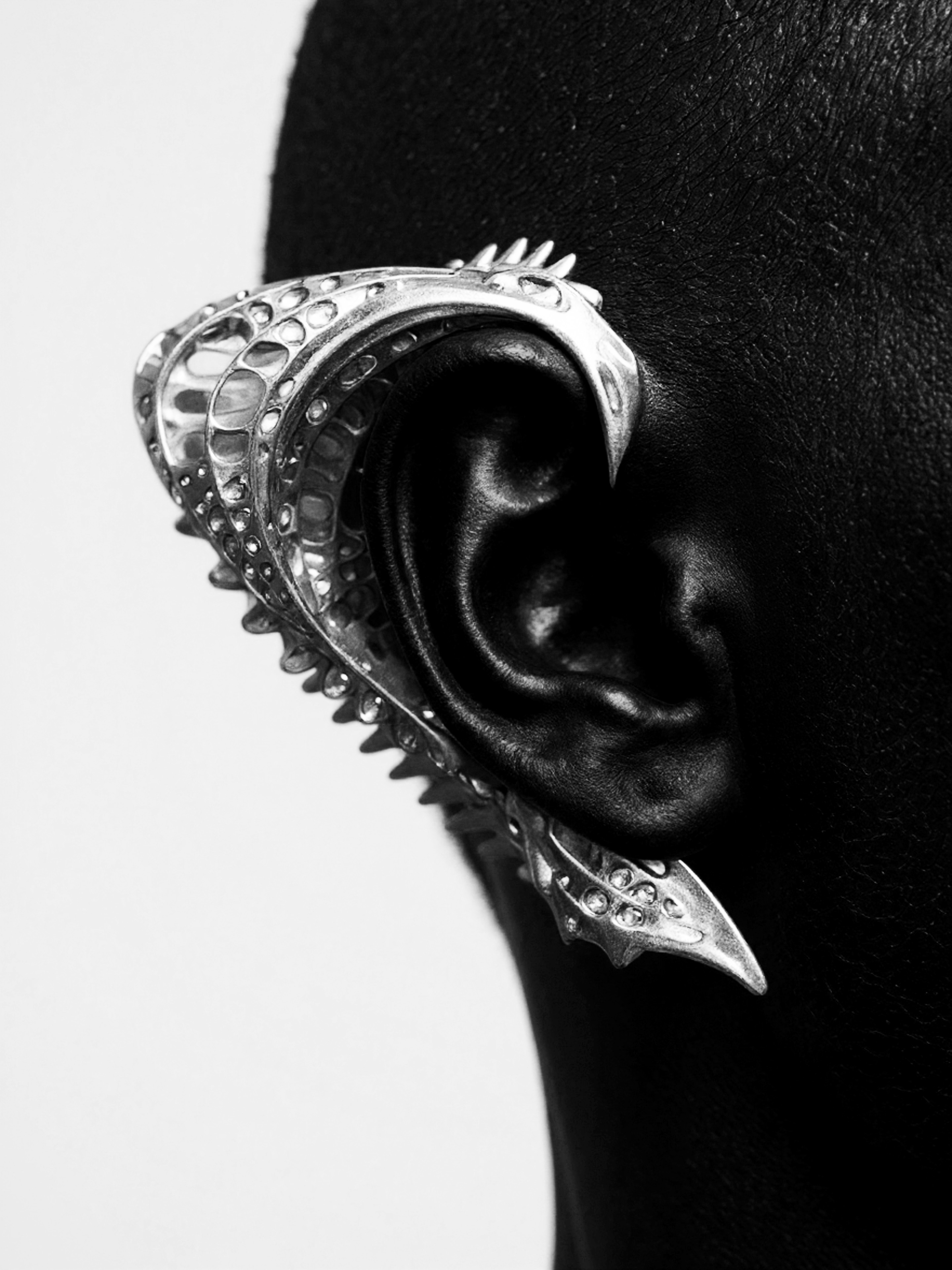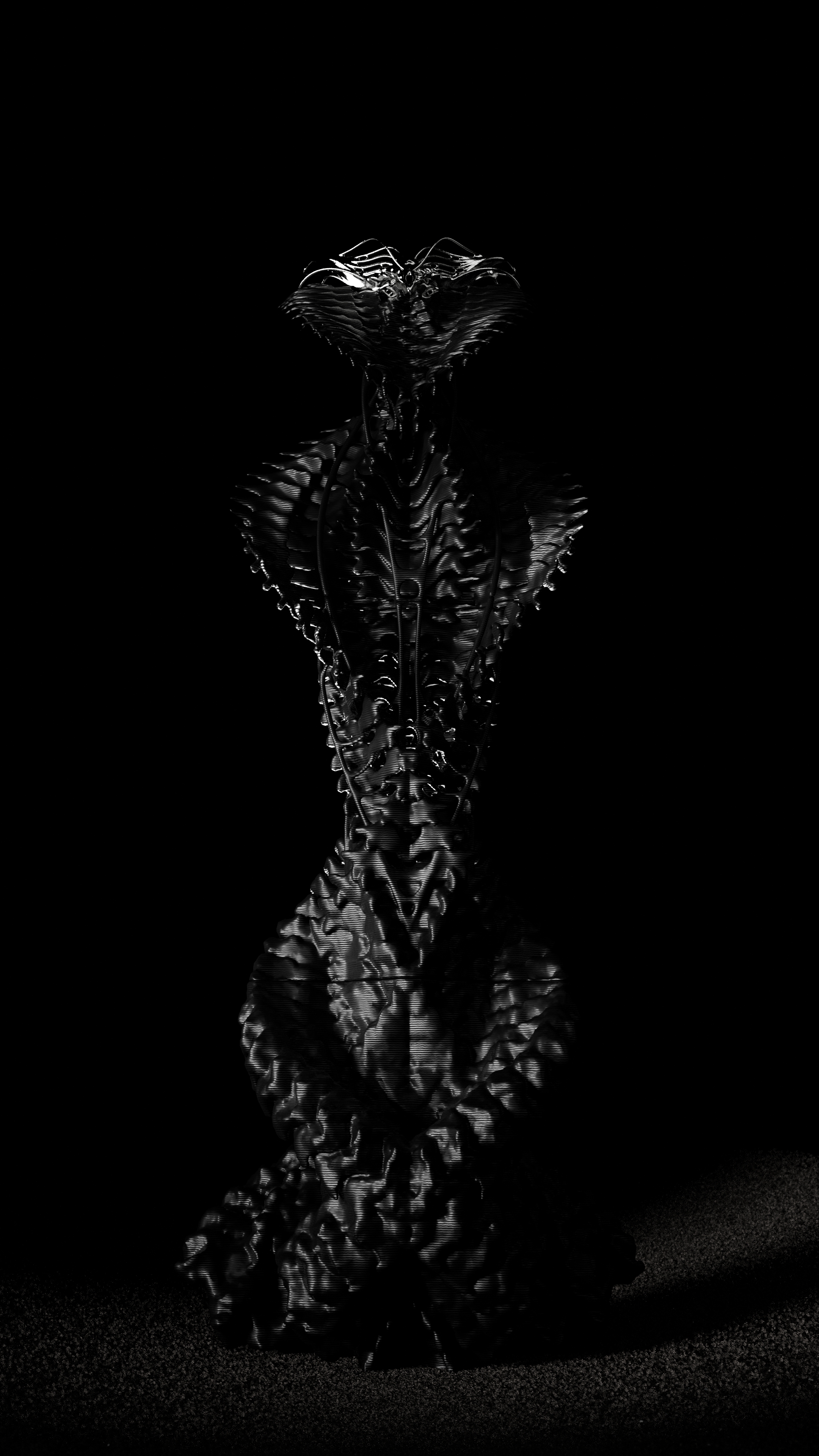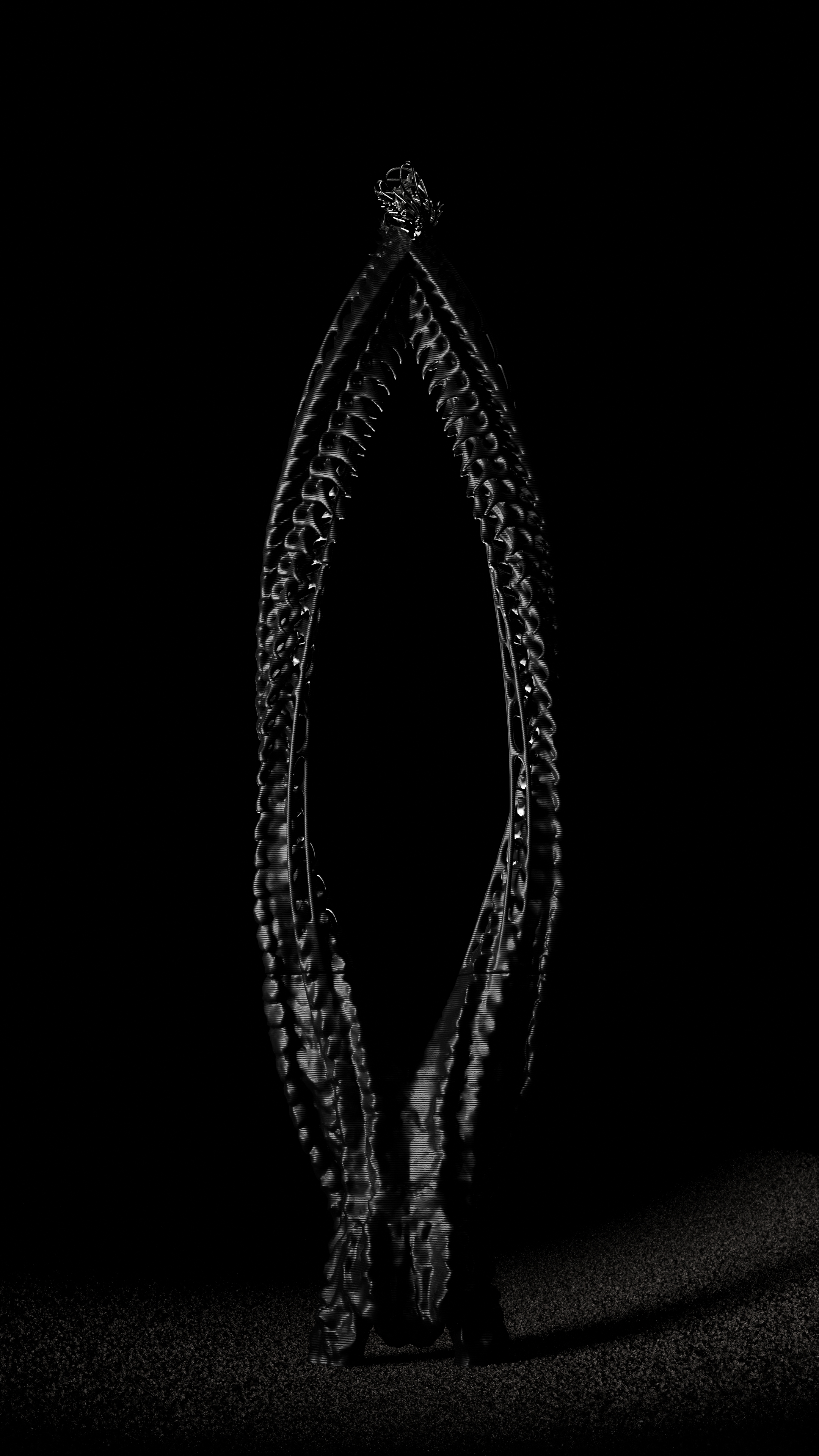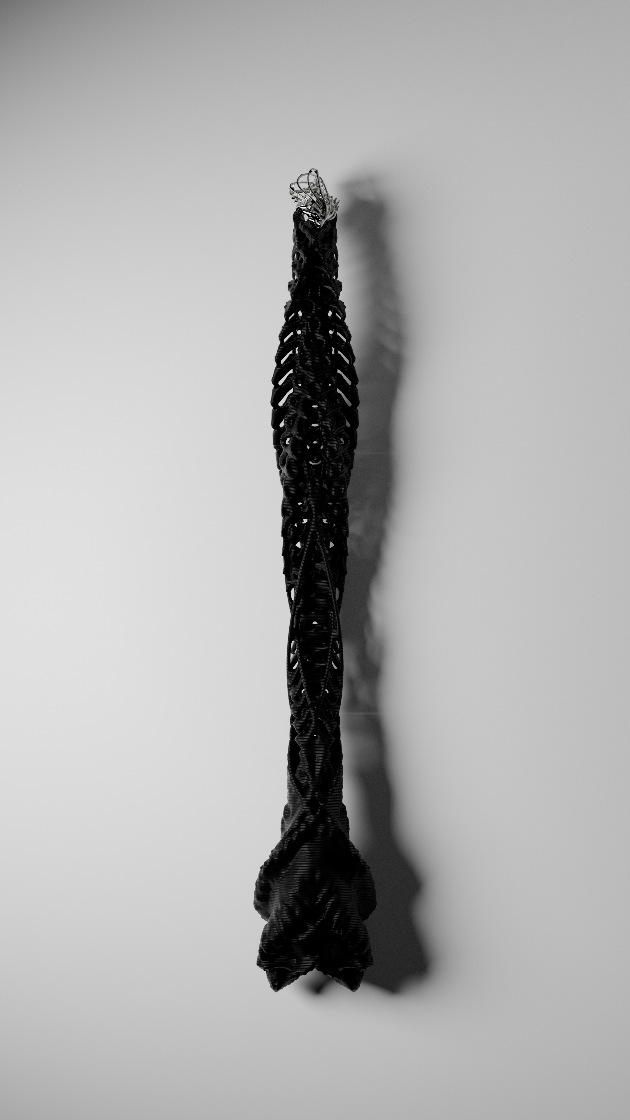 Through additive manufacturing processes and art-techne translations these digital forms take on physical life: evidence of a parallel evolution, a speculative ecosystem where nature is not only observed, but rewritten. These digital forms, made manifest, take root on the human body, shaping its physical architecture in ways foreign yet familiar.